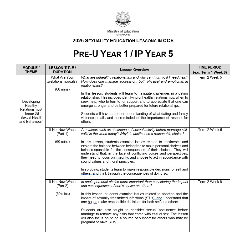 At Victoria Junior College, the following Sexuality Education lessons will be taught in 2026: