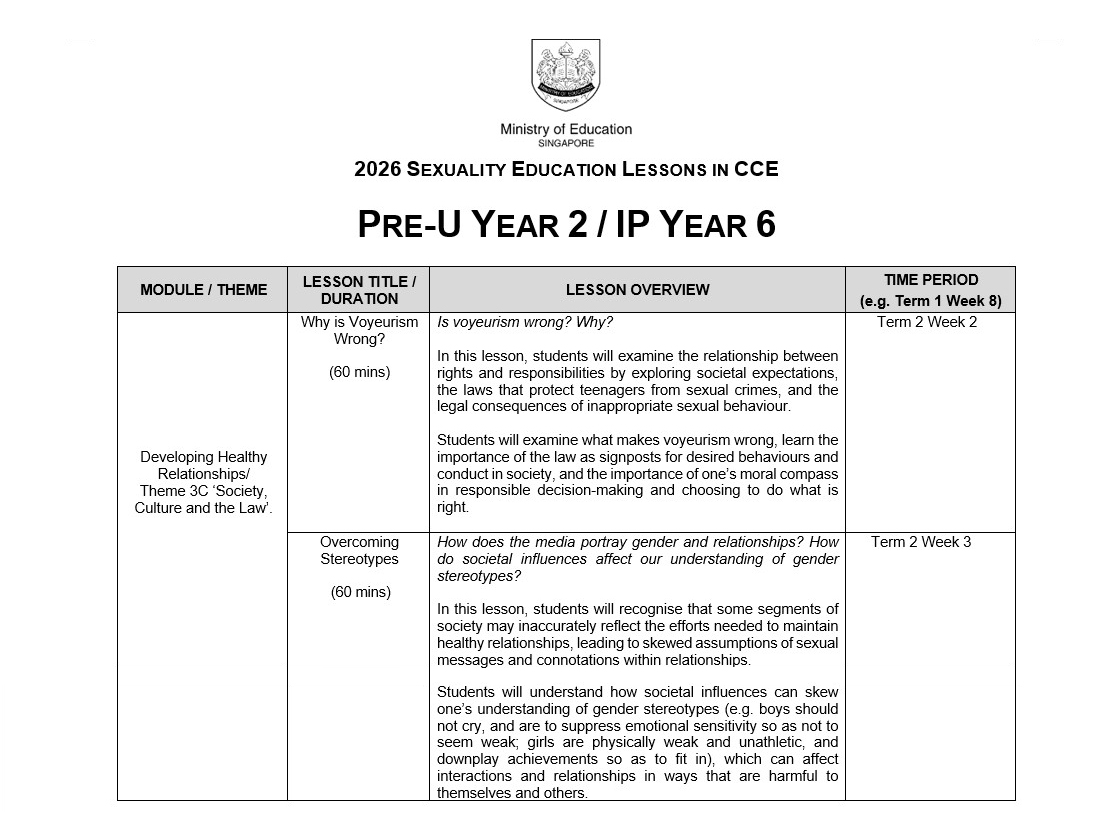OVERVIEW OF VICTORIA JUNIOR COLLEGE’S SEXUALITY EDUCATION PROGRAMME FOR 2026